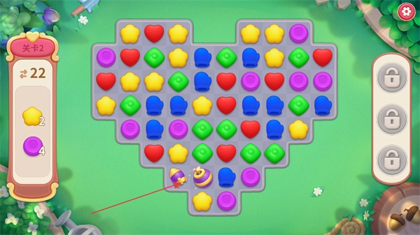 1、在关卡2里,消除颜色相同的图标,积攒左侧目标道具黄色星星与紫色道具,推动关卡进度。