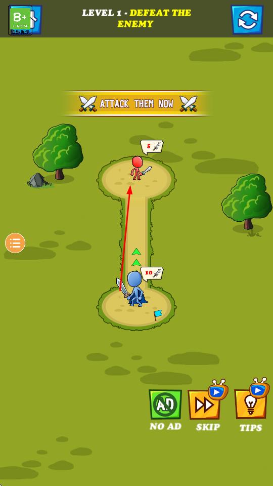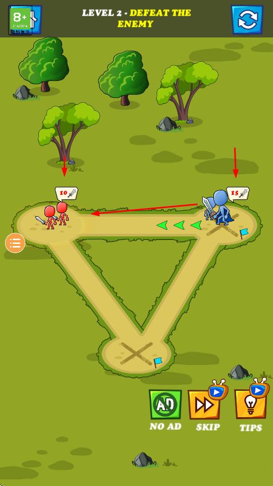 2、角色头顶的数字代表兵力值,战斗过程中要确保我方兵力高于敌方,凭借数值上的优势战胜敌人,从而推进关卡进度。