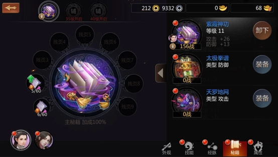 每个角色最多可装备三本秘籍,其中主秘籍的属性加成效果为100%,第一本辅秘籍的属性加成效果是30%,第二本辅秘籍的属性加成效果则为20%。