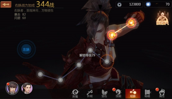 点击【角色】→【经脉】→选择【左脉】或【右脉】→挑选要打通的穴位→在穴位中打通气门,就能获得战力与属性的加成!