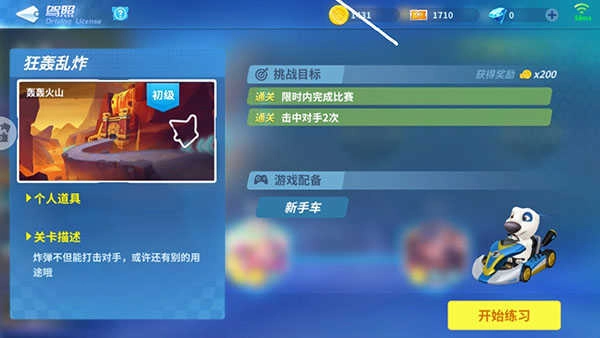 以初级驾照为例,玩家需要进行火箭起步、瞄准射击、转弯漂移、铜墙铁壁与狂轰乱炸五个小比赛,每个比赛都有该比赛需要完成的挑战目标,但共同的要求就是必须按时完成比赛,每个关卡的难度均不同,有些关卡不仅挑战目标十分有难度,而且关卡路线十分崎岖,让玩家难以完成比赛。玩家通过最后一关狂轰乱炸之后便能一个蓝色的驾照徽章以及改装点了,驾照徽章便是驾照的象征。