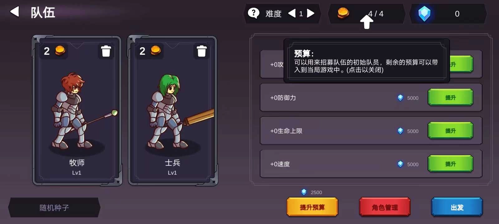 2、接下来,玩家能够借助预算招募队伍的初始成员,剩余的预算可以保留至本局游戏内使用。在此环节还能开展角色管理操作,系统会为玩家提供丰富的角色选择,但部分角色需要达到特定星级条件方可解锁。完成上述步骤后,点击右下角的【出发】按钮即可。