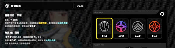 除了外观的介绍,首先给大家介绍一下雅的普通攻击:风花,一共有五段的攻击,前三段是物理性伤害,后两段是附带冰属性的伤害,每一次第五段战机发动都会激活1点魔刃值,并且还有一个分支技:霜月,在实战积累三次第五段伤害之后可以长按普攻实战强力的冰属性斩击。