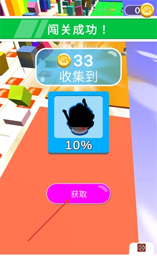 4、闯关成功后点击【获取】按钮,领取33个金币和10%进度奖励,继续挑战下一关。