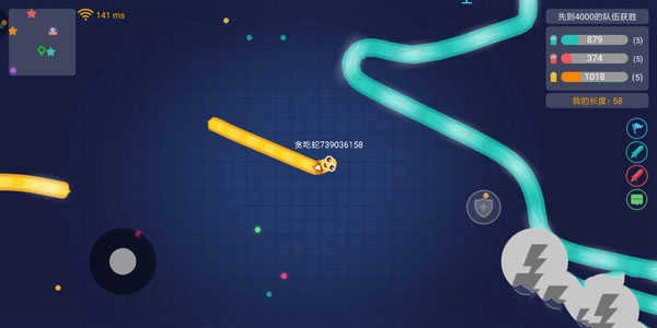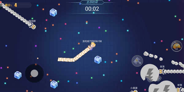 在游戏界面里,玩家左手的操作圈负责移动和调整方位,右手区域则用来操控加速技能的开启与关闭。使用加速技能会消耗小蛇的部分长度,所以要留意把控技能的释放时机。
