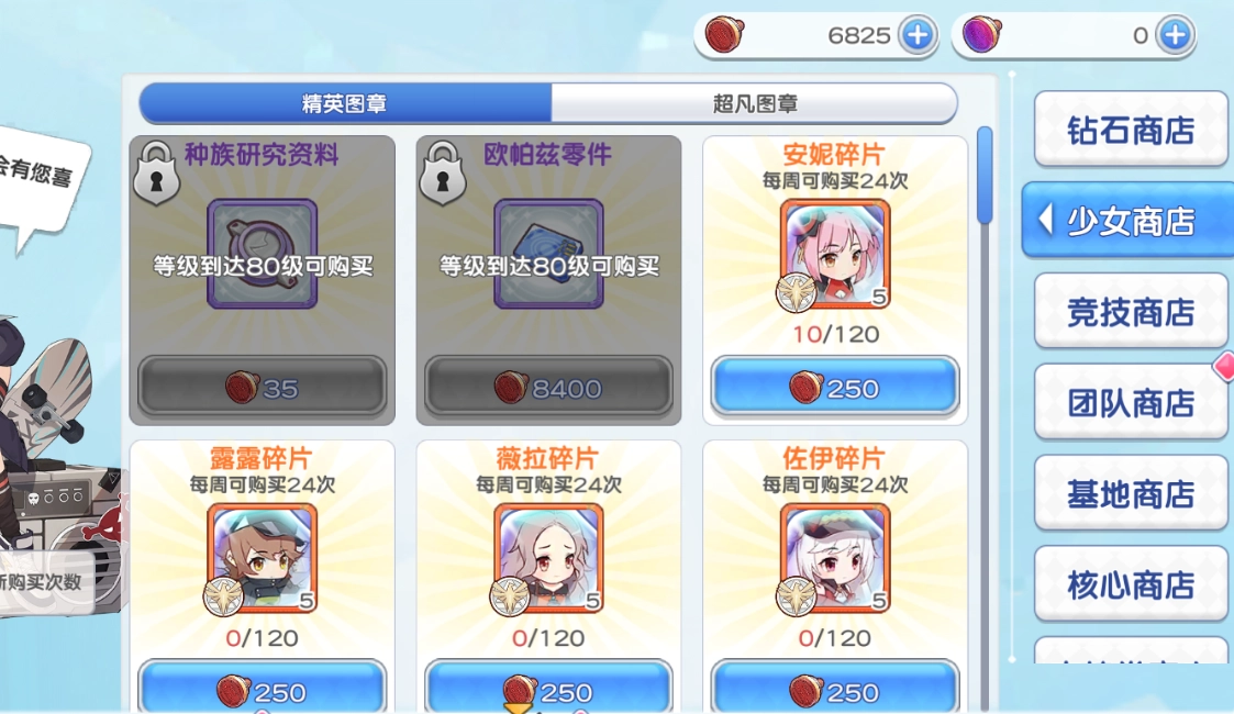④紫色及以下少女五星后的碎片直接出售就行,出售后的获得的图章在60级以后少女商店才陆续开放,传说及以上溢出的碎片需要留着,在80级会有大用(具体内容前往80级同盟誓约一节观看)。少女商店前期建议买必练的但自己练度不高的少女例如安妮千夏克罗爱等(部分少女要一定等级才开放兑换例如克罗爱75级才能买),练差不多后可以买前两个道具用来升级80级开的同盟誓约。超凡图章那一栏很长一段时间基本不用管,和精英图章类似。