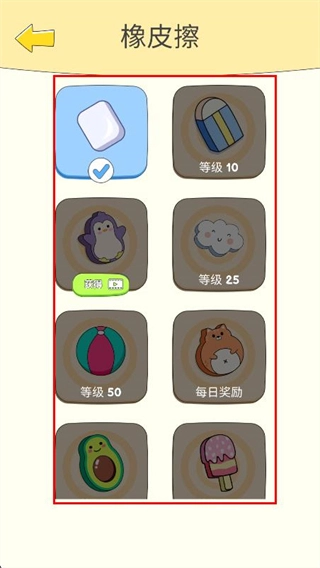 橡皮擦道具不仅有基础样式,还包含企鹅、云朵等萌系造型,红色框选的道具列表,不同道具对应不同关卡的解锁条件,收集过程像集邮一样充满期待感。