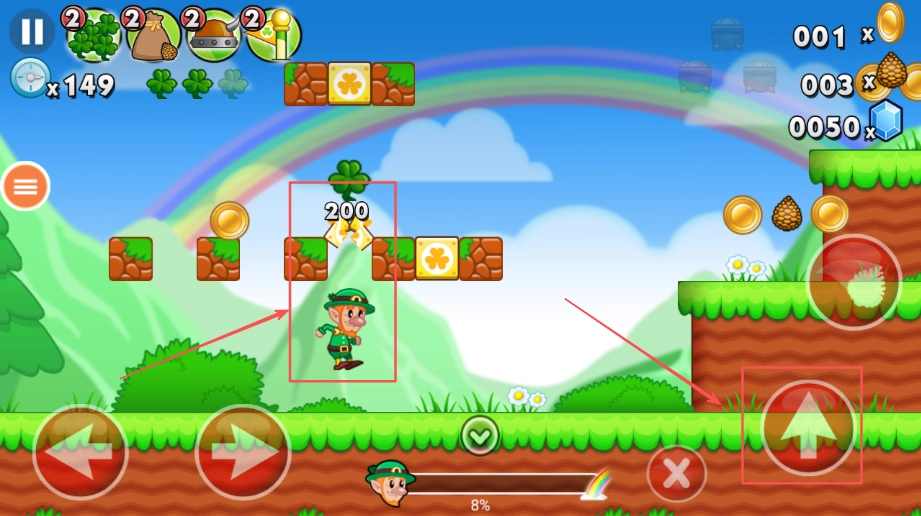 4、在移动过程中遇到带有三叶草的方块时,先将马里奥移动到方块正下方,再点击屏幕上向上跳的箭头,让马里奥用头顶撞方块,会爆出金币。