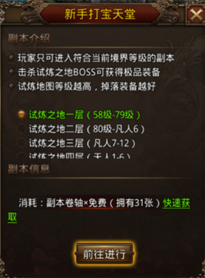 4、完成之前的任务后,便能顺利抵达(试炼之地)。此地拥有众多BOSS,还有契合你等级的游戏装备。现阶段角色所需的装备,均可从(试炼之地)的BOSS处获取,能让你的装备愈发华丽,属性也大幅提升。