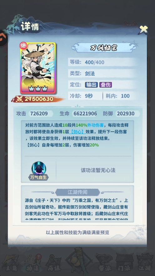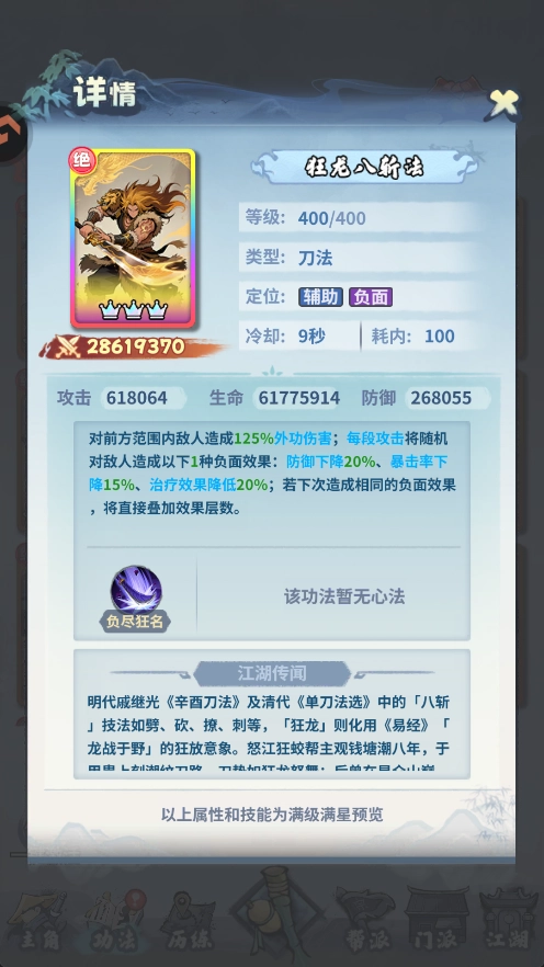 等级的话,优先升想要拿来当主c的功法,这里推荐九真拳或者太极剑,升到超出其他功法20级后,再去升其他功法。