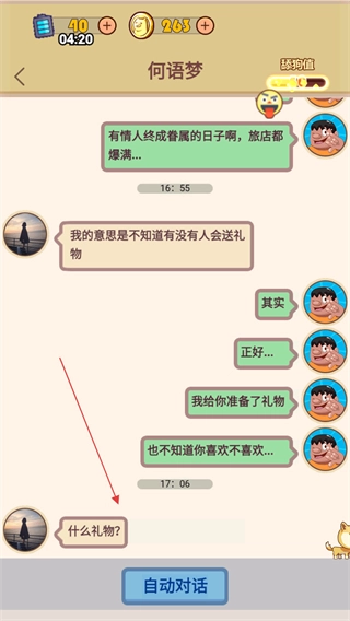 2、在聊天界面点击自动对话,即可触发与何语梦的送礼相关聊天内容。