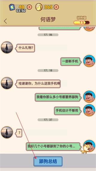 3、聊天流程结束后,点击“舔狗总结”按钮,即可结算当前关卡的舔狗值。