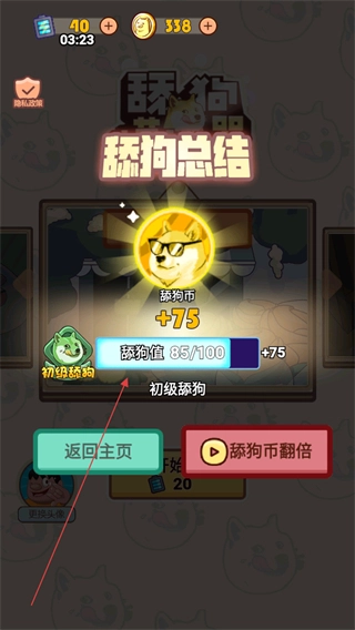 4、在总结页面查看自己获得的舔狗币之类的奖励,之后点击返回主页,为下一关做准备。