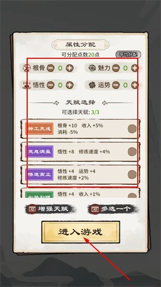 1、进入属性分配界面后,完成属性点的分配,并且选定对应的天赋,随后点击进入游戏,开启属于你的仙途之旅。