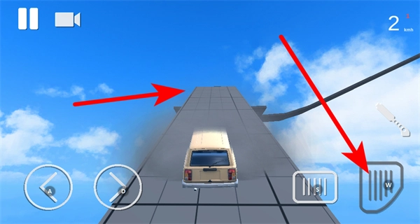 4、利用右下角的油门键来控制车速,驾驶车辆朝着坡道类赛道行进,这是熟悉特技赛道驾驶节奏的操作方式,可通过油门来调整车辆的行驶状态。