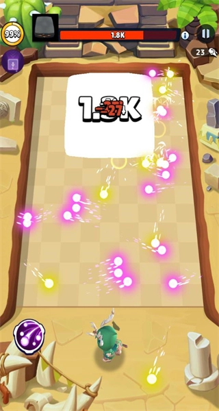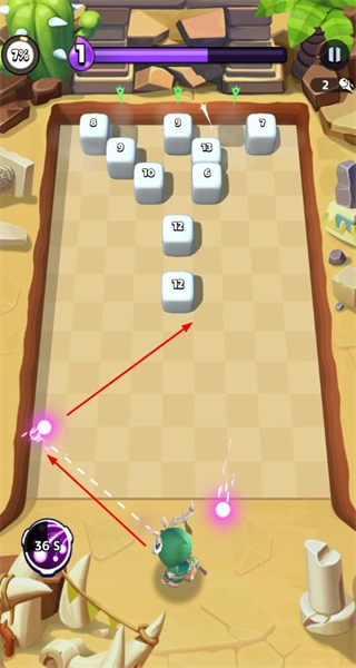 1、操控角色发射子弹,击中场景中的数字方块,通过弹射机制消除方块,推进关卡进度。