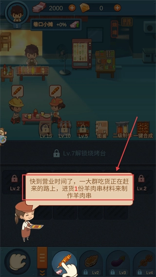 1、营业前按照提示进购1份【羊肉串】食材,制作羊肉串来应对即将到来的食客。