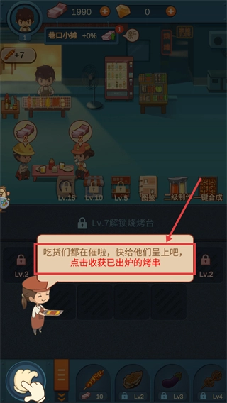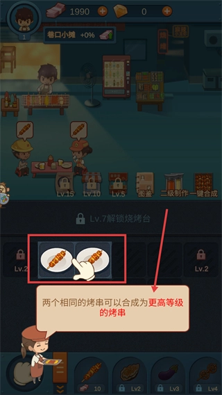 2、把两个等级一样的【烤串】合并起来,就能合成等级更高的烤串,从而让菜品品质和收益都得到提升。