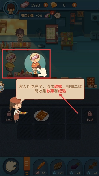 4、客人用餐结束后点击结账,可收集【钞票】与【经验】来积累资源,助力店铺升级。