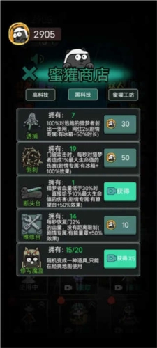 去蜜罐商店选购道具时,黑科技分类下的维修台和能量罩是必入款——搭配使用后维修台能额外提升50%的效果。其余道具可根据关卡需求灵活购买。另外注意商城福利:观看视频能领房门升级卡,还有修勾魔盒(既能在剧情里随机变身为某类道具,也能免费用于炮塔升级)。