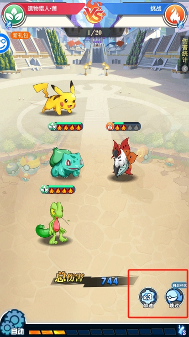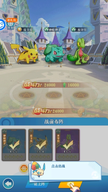 4、选好了精灵后就可以开始作战了,游戏可以放置挂机,会自动攻击,当敌人太过强大时也可以选择先强化再出战。