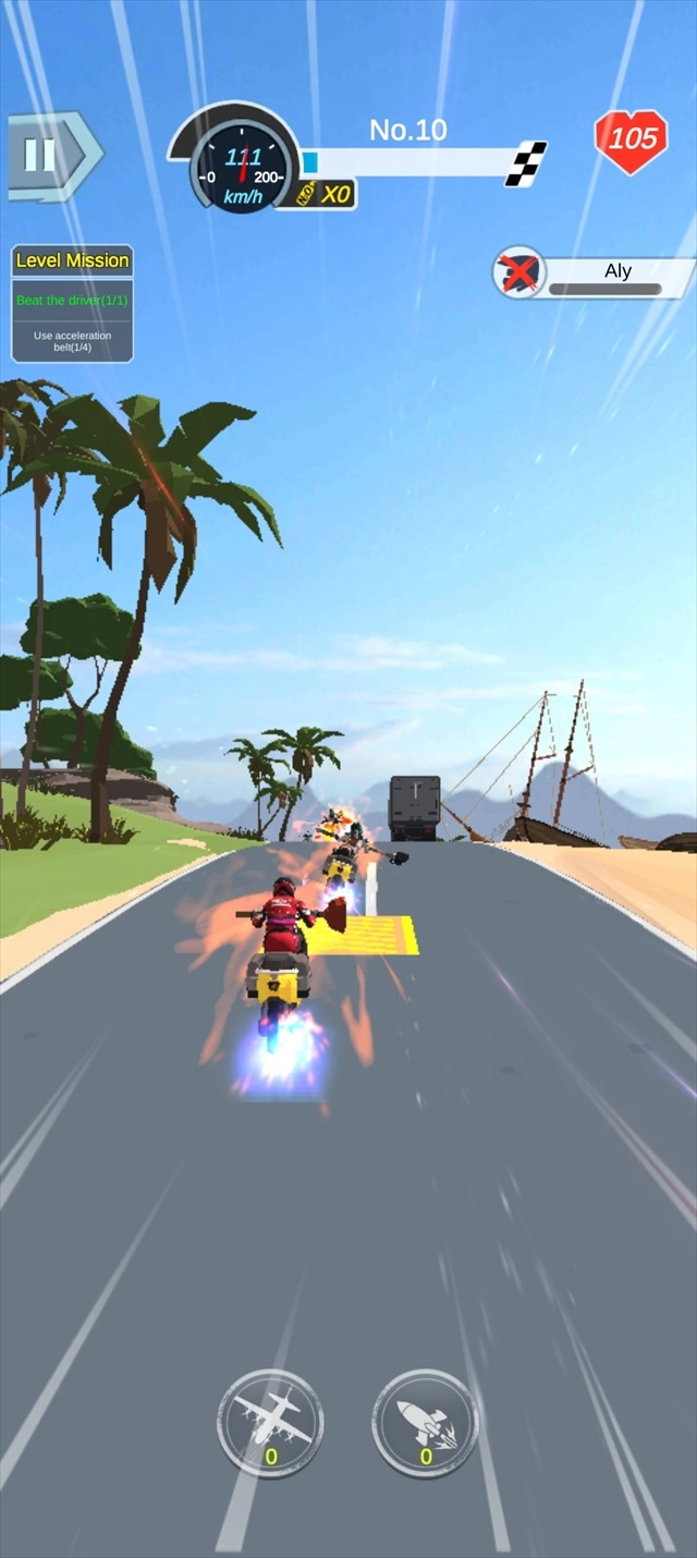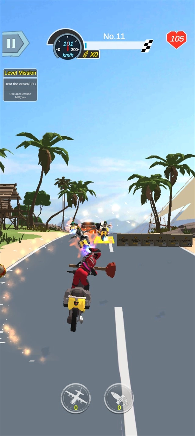 4、武器的使用方式与拾取到的武器种类相关:当你靠近对手的摩托时,角色会自动用武器攻击对手;若是远程武器,则会直接攻击你正前方距离最近的一名对手。