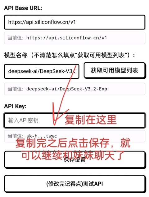 7、把下方的密钥复制进去然后点击保存,就能继续和妹妹聊天啦。