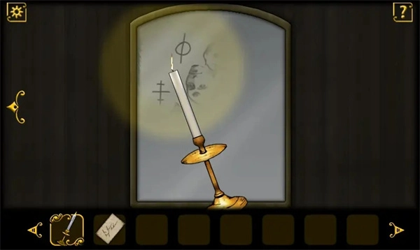 往里走进去,能看到墙上的地图和小圆几上的蜡烛台。旁边的墙上有个谜题。接着继续往里面走,进入左边的门里,梳妆台的镜子上夹着一张纸片,上面写着:光明总能揭露真相。用钥匙打开梳妆台的柜门,按下右边的红色按钮,就会看到变换的字母和与之对应的图形。房间里右边的柜子上好像缺了点什么。