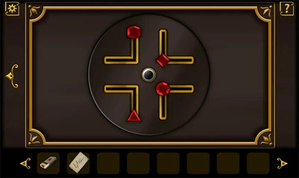 5、来到走廊地图旁的谜题前,上面正是fate所代表的几个图形。利用纸条的提示,可以解开这个谜题。点击中央圆钮旋转圆盘,把每个图形放置到正确的位置便可以了。得到钥匙。