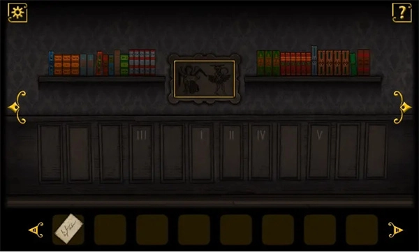 3、回到走廊,右边门锁上了,往右走,看见堆满了书的书架,以及墙上的格子上的数字。仔细数数,格子数和钢琴键的数目是一样的,这是否就是钢琴谜题的解法?按照墙上格子的提示,那么按键的按法就应该是:6,7,4,8,10。回到钢琴那里按键,果然打开一个暗格,得到一把钥匙。