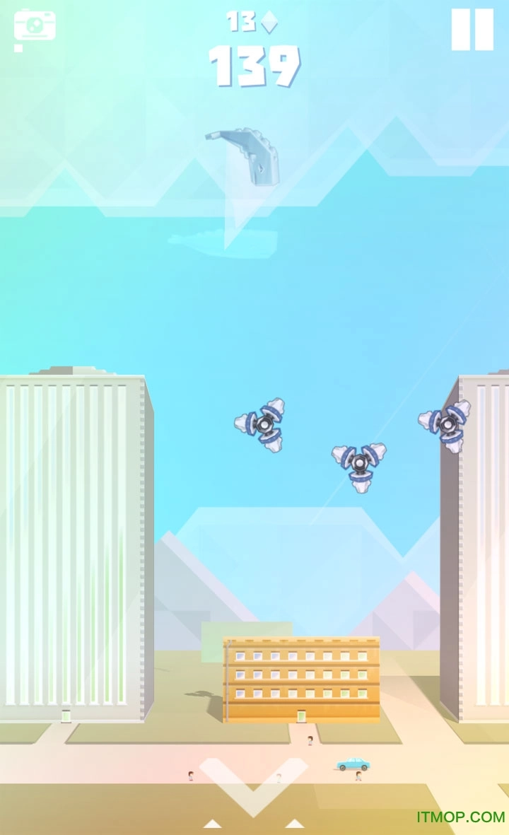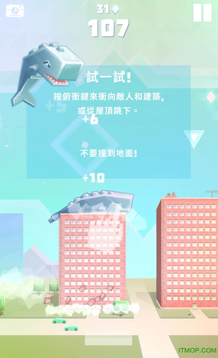 屏幕正下方是攻击键,其功能是让鲸鱼身体快速下沉,凭借体重压制外星机器人。但需要注意的是,变身之后鲸鱼的体积会增大,此时使用下沉攻击可能会压塌楼房,进而因接触地面导致死亡。