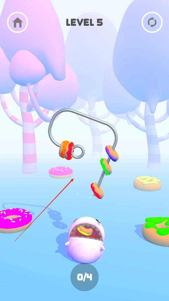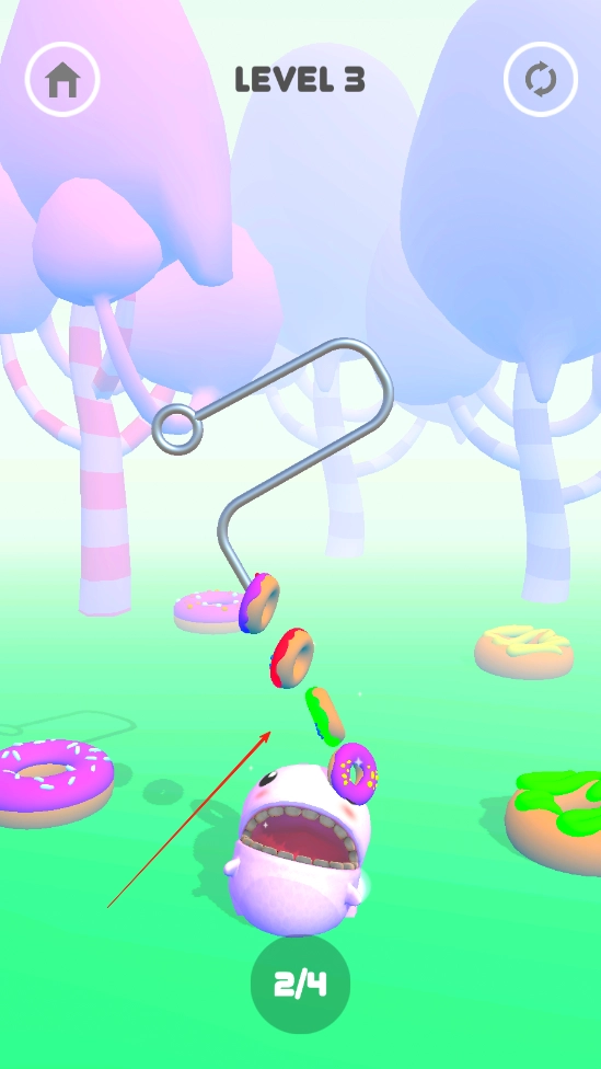 观察钢丝的造型与彩色甜甜圈的位置,我们得转动钢丝,让甜甜圈顺着惯性掉下来,落进小怪兽的嘴巴里。