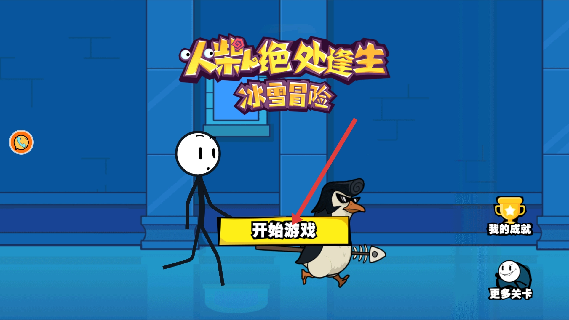 进入火柴人绝处逢生游戏,点击“开始游戏”按钮,就能开启火柴人与企鹅伙伴的冰雪冒险,正式踏入充满挑战的关卡世界,准备迎接各种难题与抉择。