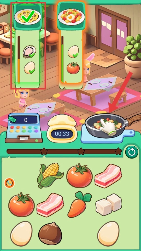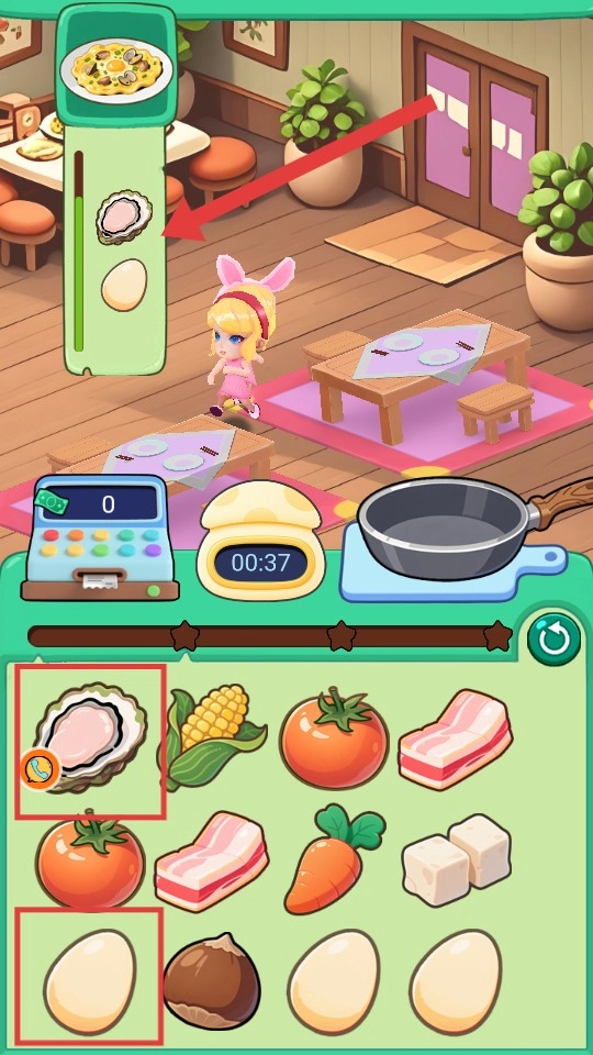 2、进入游戏后,留意屏幕左侧顾客【订单】所需的食材,从下方食材栏中点击选择对应的【生蚝】【鸡蛋】等食材。