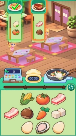 3、收集齐订单所需食材后,会出现对勾标识,点击【烹饪】按钮开始制作菜肴,满足顾客订单需求。