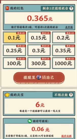 在游戏里,玩家能够借助烹饪美味菜品、招待顾客完成订单、提升餐厅等级等途径获取红包与元宝。一旦积累的金额达到特定数目,就能够申请提现了。