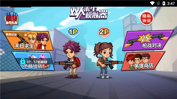 《双人求生模拟器》是一款以双人合作为核心玩法的休闲射击闯关游戏。在游戏中,玩家能和好友组队,一同对抗末日里汹涌的丧尸潮,感受紧张刺激又充满欢乐的割草式生存挑战。游戏包含“末日求生”与“枪战对决”两大核心模式:前者可让玩家携手攻克关卡,后者则支持同屏进行PK竞技,让玩家既能体验协作的默契,又能享受对抗的快感。游戏操作简便、节奏轻快,再加上多样的关卡设计与酷炫的武器系统,不管是单人练习熟悉玩法,还是双人组队娱乐放松,都能获得畅快的游戏体验!