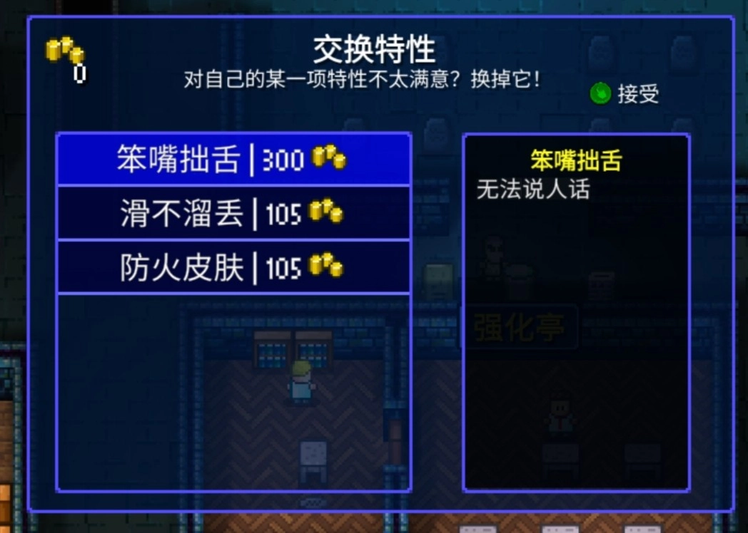 技能交换仅在同一档位内进行。和“笨嘴拙舌”同等级的技能包括“小精灵”与“和平主义者”,个人不太建议交换这一档的技能;若后期实在没拿到翻译器,倒是可以尝试赌一把——赌到“和平主义者”就血赚,赌到“小精灵”基本就凉凉。“滑不溜丢”和“防火皮肤”属于同一档位,不过这个档位的技能数量较多,像“凌波微步”“爆炸幸存者”“人多力量大(更安全)”都是比较有代表性的,正因为技能种类繁杂,所以每层只能交换其中特定的几种。“防火皮肤”如果不升级的话几乎没什么用,可以花105金币去交换;而“滑不溜丢”对外星人来说还是挺实用的,不推荐拿去交换。