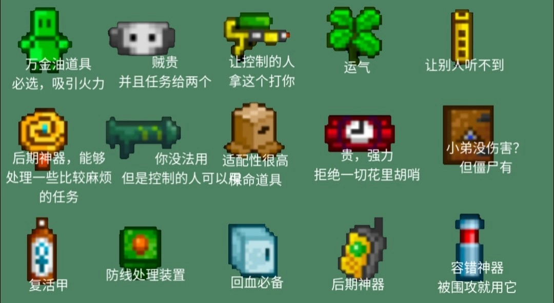 以上就是我个人比较推荐的道具啦,不过每个人的想法都不一样,大家可以根据自己对各个道具的了解,去大厅的奖励配置那里调整修改。但要注意别选增伤药品和武器哦——先说说增伤药品,因为外星人造成的伤害始终是1点,不管我们喝什么增伤药水都没法获得加成;要是把它给被控制的角色,操作起来又比较僵硬,实际效果也不太明显。所以药品方面,选再生香波这一种就够了。