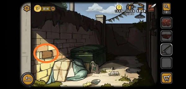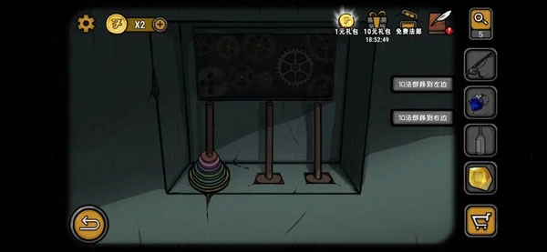 进入屋内后,按照惯例进行了一番搜索。找到了铜线、胶水、齿轮和位于圈圈位置的工具箱,还顺手打开了箭头位置的三个开关。