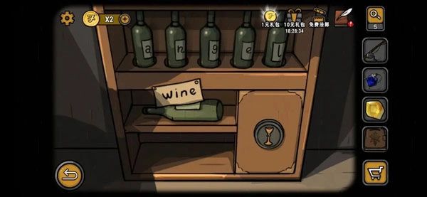 走到另一侧的酒柜旁,把酒瓶排列成“angel天使”的字样,再放进半个圣杯。接着在旁边天使雕像的托盘上,按照童谣里的顺序(红黄绿蓝)摆放宝石,一间密室随即开启,目标白兰地很快就拿到手了。