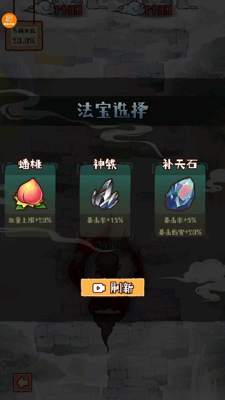 法宝界面如图所示,攻打关卡BOSS即可获得法宝,挑选一种使用,能够提高血量上限