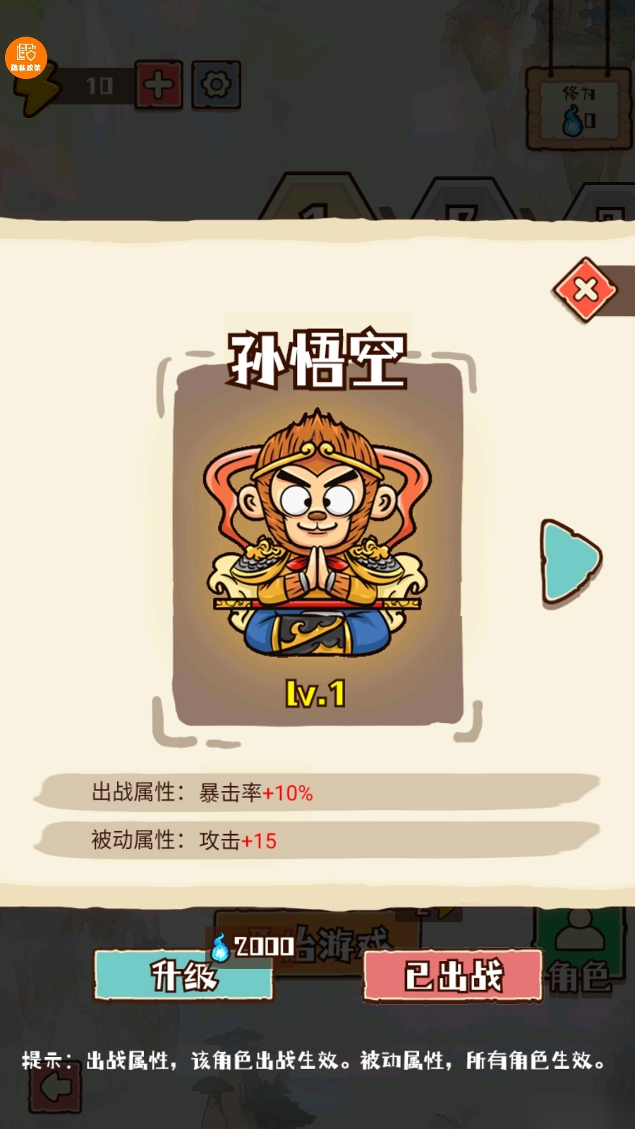 提供不同的射箭角色,支持孙悟空、唐僧、猪八戒,每种角色显示不同的战斗属性