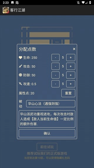 3、华山心法、花源心法、武当心法、丐帮心法等众多功法可供自由选择,每一种功法都独具特色,有遇强则强的,有越打越快的,还有越打越强的,类型十分丰富。