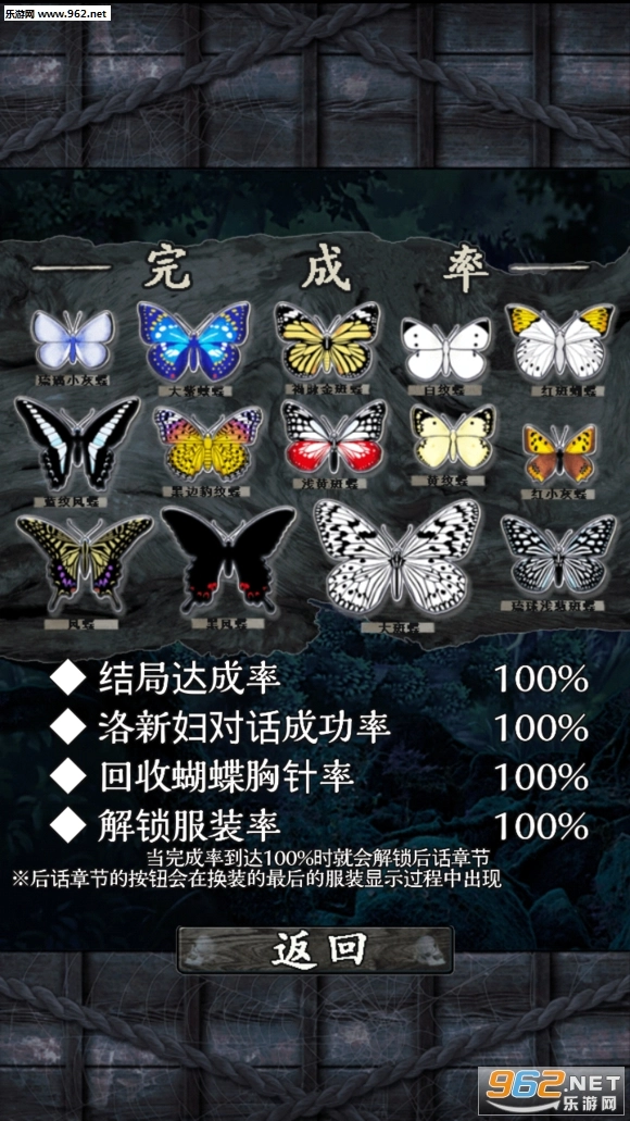 蝴蝶回收率这一功能需要通关一次后才会解锁,从第一章到最终章,每一章都有两只蝴蝶,总共是14只。