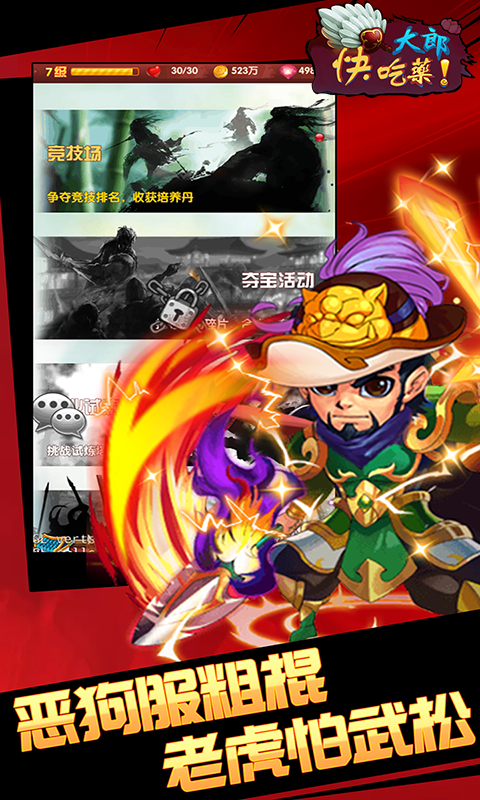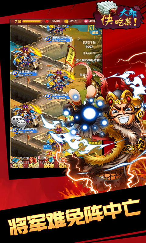 大郎快吃药提供多种武将选择,支持排兵布阵与阵容策略搭配,合理组合武将可释放特殊组合技能,助力战斗胜利。新增的武将养成系统,让玩家通过完成任务解锁装备与技能,深度培养武将实力.