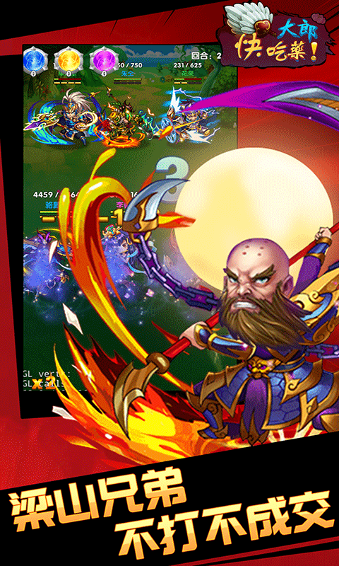 大郎快吃药是一款国风武侠题材的策略卡牌,以漫画式Q萌画面还原水浒英雄故事,玩家可收集武将卡牌自由排兵布阵,通过策略组合释放组合技能,在轻松简单的操作中体验养成与对战乐趣,多变的剧情场景搭配夸张的人物表情,让水浒英雄的战斗充满沉浸感。
