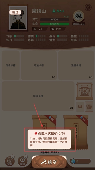 1、进行【六次挖矿】操作,可获取【灵石】解锁【卡包】,每次挖矿消耗一个月时间需累计完成。