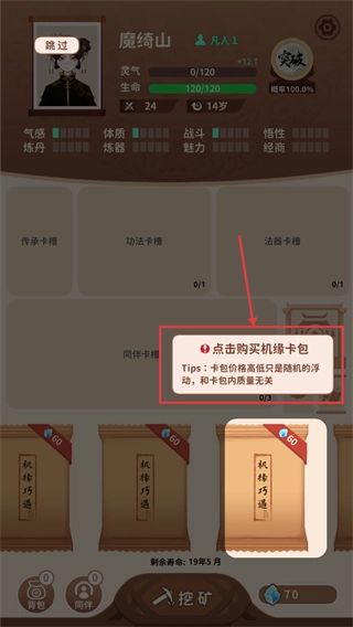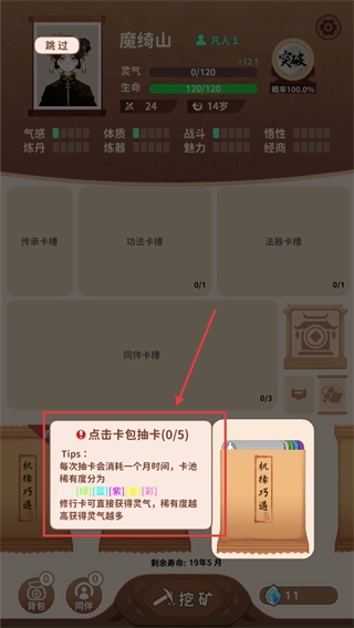 3、进行【卡包抽卡】获取卡牌,每次抽卡消耗一个月时间,稀有度高卡牌获更多【灵气】。