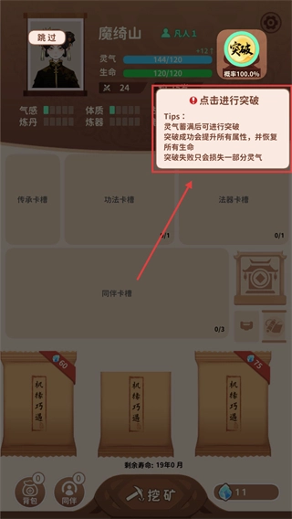 4、【灵气】蓄满时点击突破,成功提升所有属性恢复生命,失败仅损失部分【灵气】。